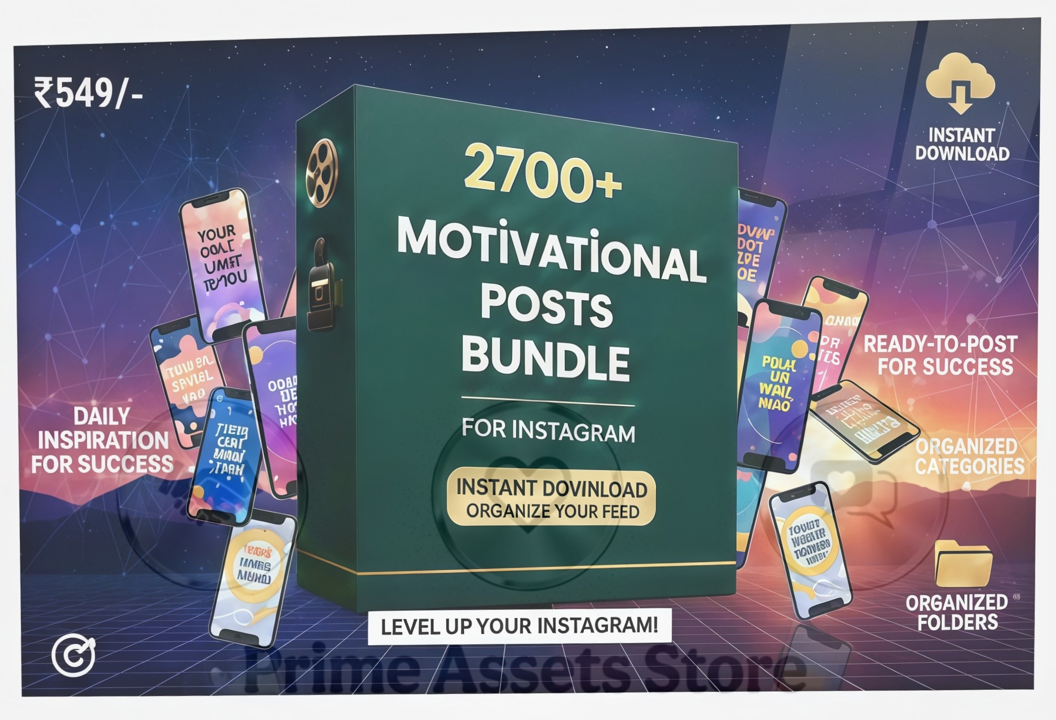 This is a 2700+ Motivational Posts Bundle for Instagram selling for ₹29/-. It offers instant download of ready-to-post content, organized into folders and categories, to provide daily inspiration and help you level up your Instagram feed.