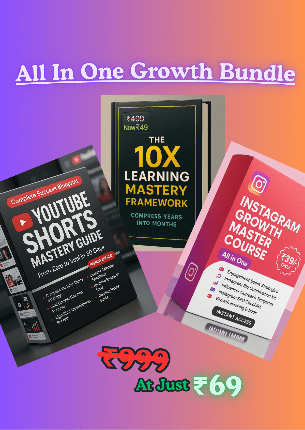 Unlock your full potential with the All-in-One Growth Bundle — a 3-in-1 digital powerhouse combining the 10x Learning Mastery Framework, YouTube Shorts Mastery Guide, and Instagram Master Course. Perfect for creators, learners, and entrepreneurs who want to dominate the digital world.