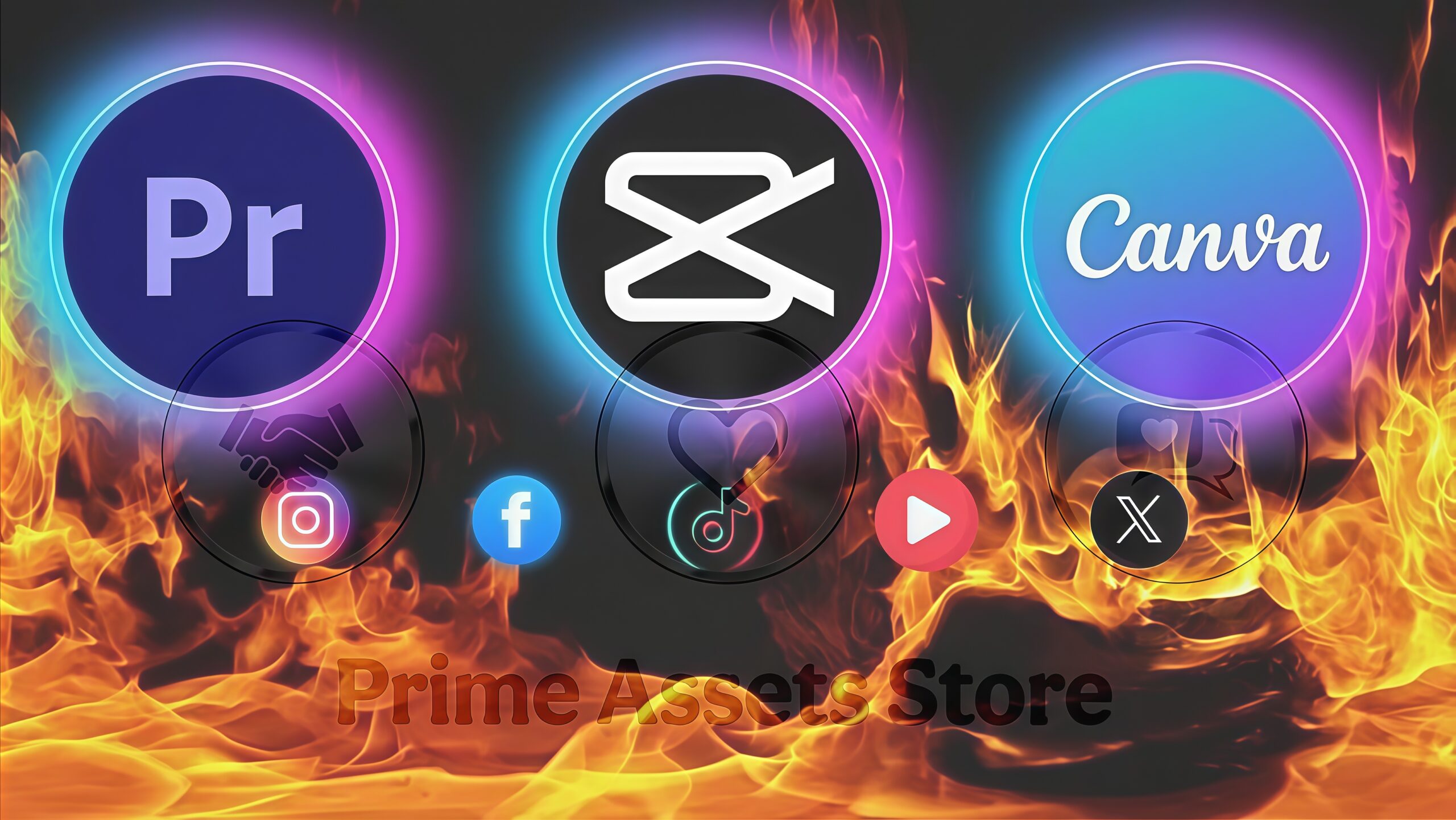 This vibrant design showcases the ultimate content creation tools — Adobe Premiere Pro, CapCut, and Canva — surrounded by dynamic flames and neon glows, symbolizing creativity on fire! Perfect for video editors, designers, and social media creators who dominate platforms like Instagram, Facebook, TikTok, YouTube, and X with stunning visuals and next-level edits.