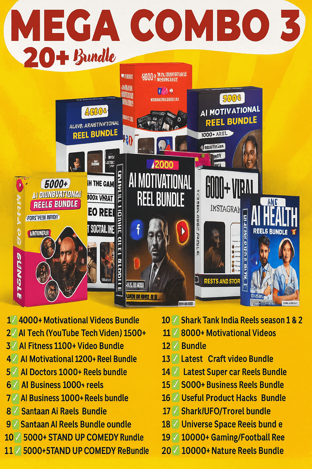 MEGA COMBO ek all-in-one pack hai jisme 20+ viral content bundles aur 100,000+ ready-to-post Reels shamil hain. Isme motivational, business, tech, fitness, comedy, gaming, nature, space, and Shark Tank jaise top niches ke high-quality AI-generated videos milte hain—sab Instagram Reels, YouTube Shorts aur Facebook ke liye optimized.